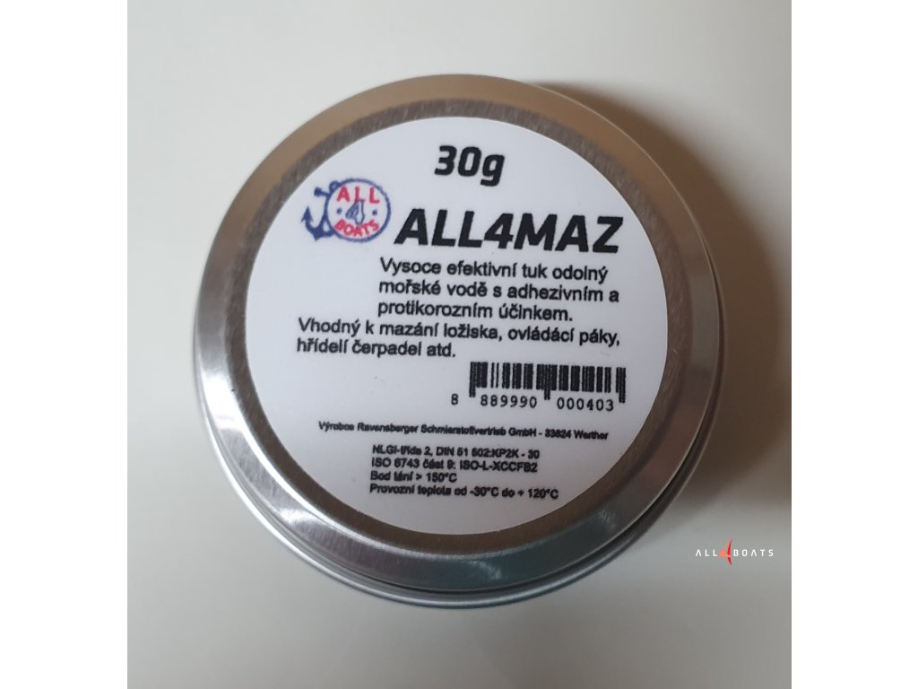 Vysoce efektivní mazací tuk odolný i mořské vodě s adhezivním a protikorozním účinkem. Vhodné k mazání ložisek, ovládacích pák, lanovodů, hřídelí atd.. Teplotní rozsah maziva je od -30°C do +120°C. Vyrobeno v Německu.