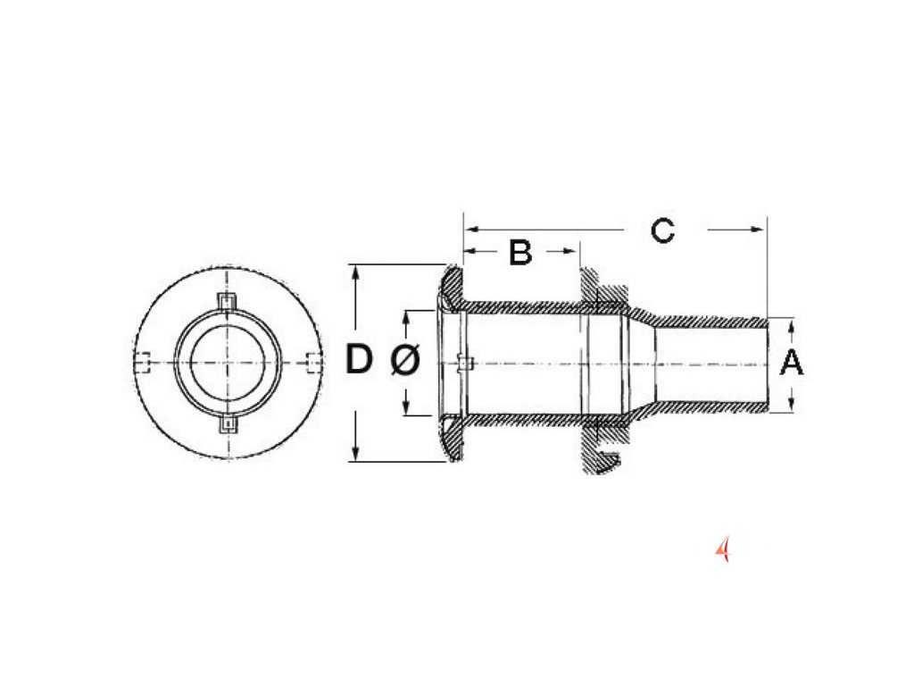 Nerezová průchodka skrz trup pro hadici. Vyrobeno z leštěné oceli AISI 316. Vybaveno konektorem pro uzemnění.