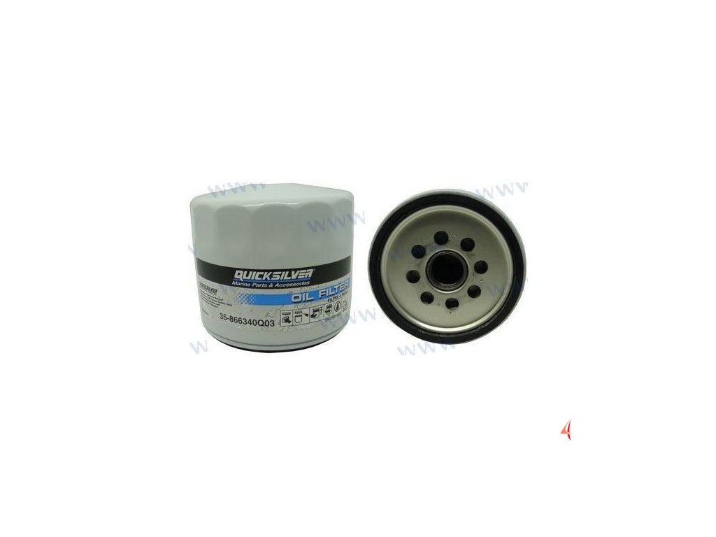 Originální olejový filtr Quicksilver 35-866340Q03 Originální olejový filtr pro všechny zabudované motory Mercruiser s výjimkou motorů 4,3L, kde je filtr umístěn mimo motor. Filtr je také vhodný pro motory 4,5L a 6,2L. Určeno pro řadové Mercruiser GM (General motors) 4 a 6 válce a pro Mercruiser GM vidlicové V-8 zabudované motory. Náhrada olejového filtru Volvo 835440-9. Náhrada také pro Pleasurecraft (PCM) GM (OEM R077002), pro OMC GM motory (náhrada za 502901 a 502902), pro Chris Craft (283, 305, 307, 350, 454), pro Crusader (OEM 201104).