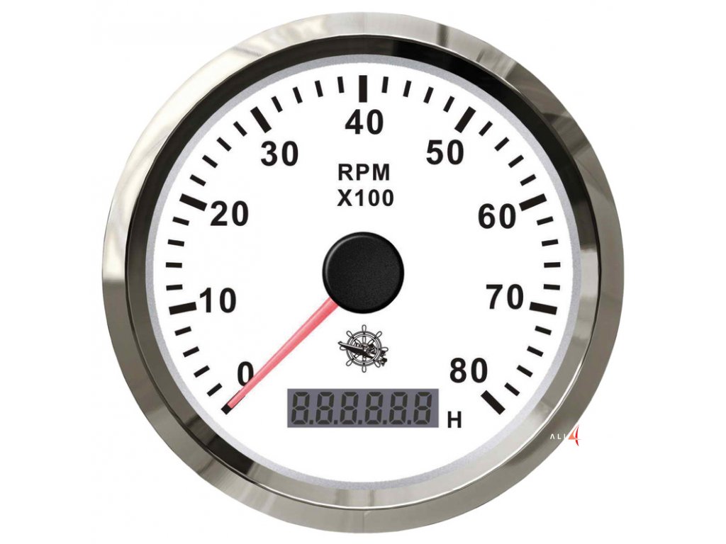 Otáčkoměr 0-6000 ot./min. Připojení ke svorce "w" alternátoru. Červeně a žlutě podsvícený ciferník. Otvor Ø 85mm.
