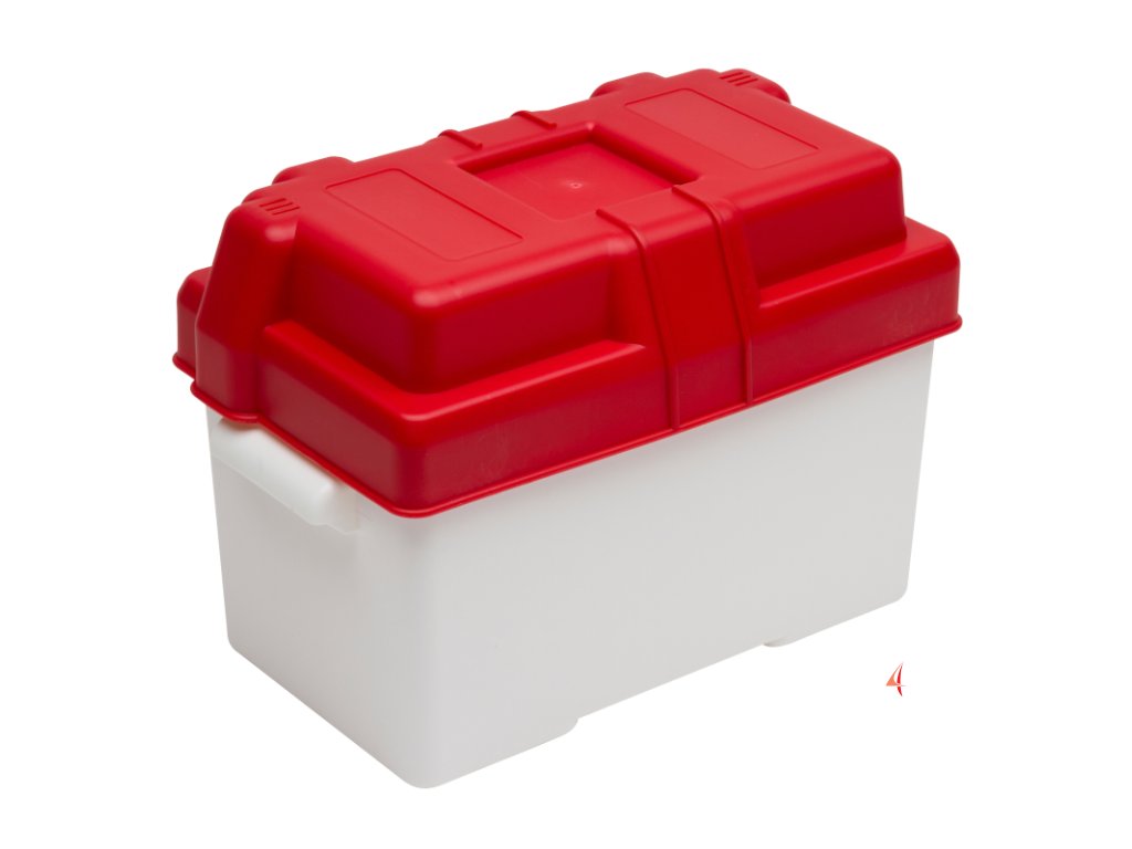 - Plastový box na baterie v bílo-červeném provedení je navržen pro bezpečné uložení baterií na palubě plavidel.