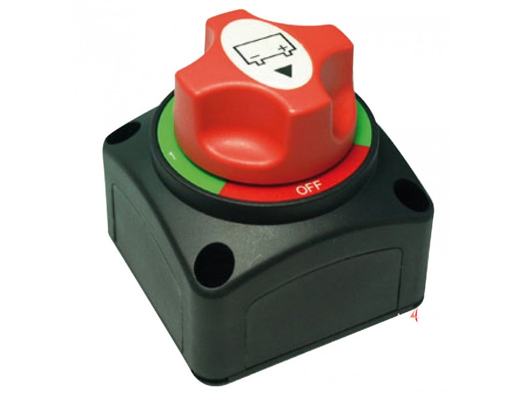 Přepínač baterií, Max kapacita 50V DC - trvale 100 A, Ø čepů 10mm, rozměr 69x69x74 h, Polohy přepínačů: Batt. 1 - Batt. 2 - Batt. 1+2 - VYPNUTO. Napětí 12/24 V.