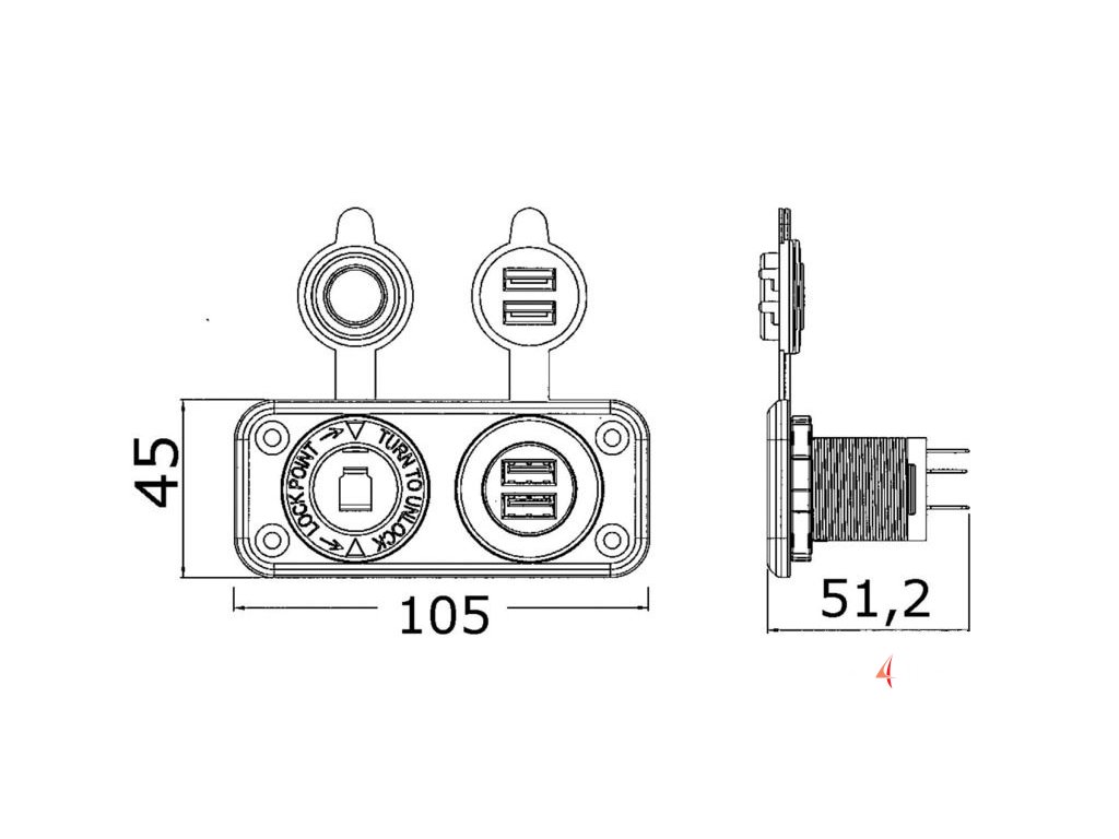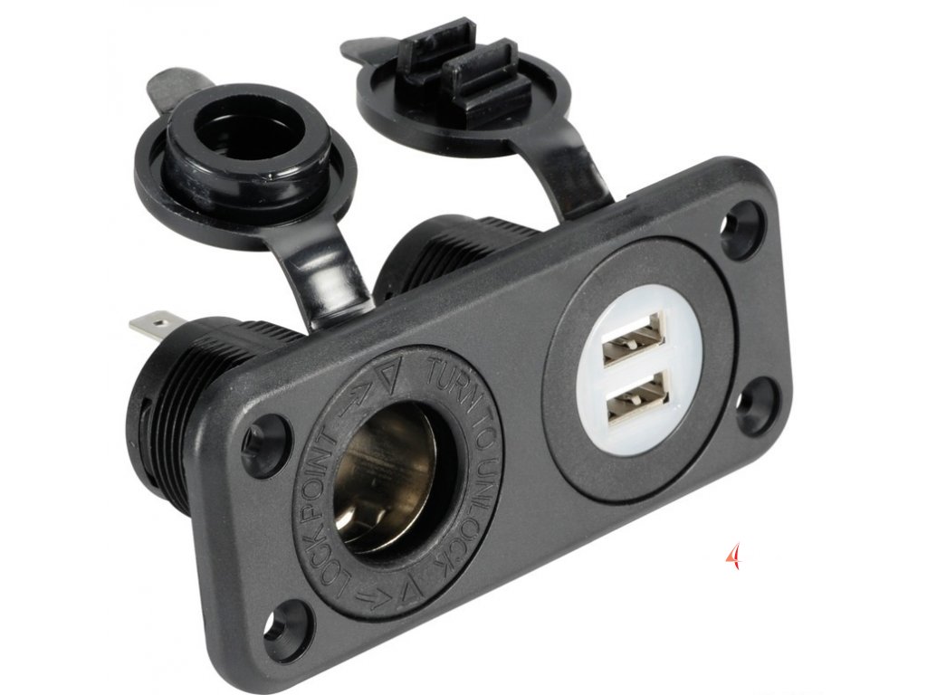 Dvojitá USB zásuvka a 12 V zásuvka na zabudování.