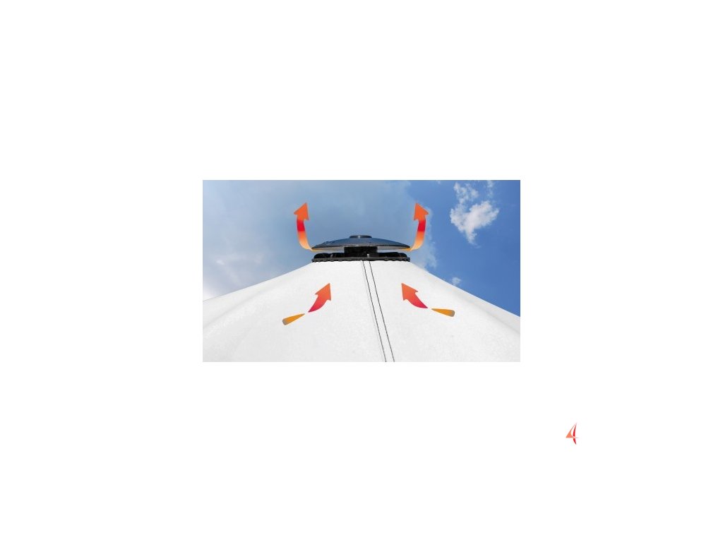 Jednoduchý a efektivní větrací otvor pro plachty. Stačí vložit větrací otvor malým otvorem do plachty a upevnit jej zevnitř protějškem. Dva příchytné panely zajišťují větrání pod plachtou. Vhodné pro teleskopickou podporu plachty. Rozměry: Vnější průměr 109 mm, otvor pro výřez 57 - 80 mm.