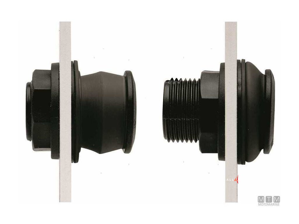 Vodotěsná spojka pro dodatečnou vpust do nádrže. Zasouvací spojka z polypropylenu s těsněním z nitrilu NBR vhodná pro nádrže na naftu. Montáž z vnější strany jednoduchým otvorem. Při zašroubování armatury se těsnění stlačí a zajistí vodotěsné utěsnění.