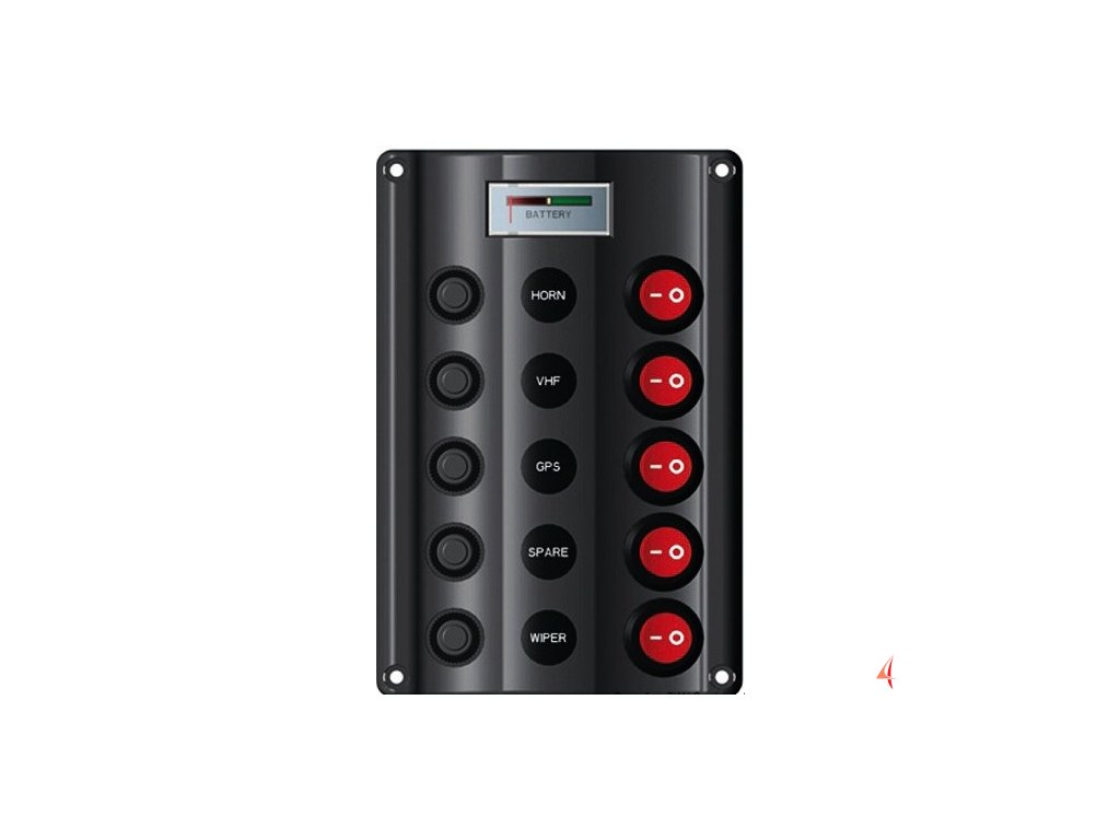 Vyrobeno z černého plastu, vybaveno přepínači a resetovatelnými tepelnými automatickými pojistkami. Vybaveno voltmetrem a nalepovacími štítky pro identifikaci různých připojených zařízení.