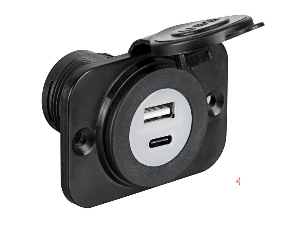 Vyrobeno z nylonu a opatřeno ochranným krytem, aby byla vodotěsná. Vstup 12/24V, výstup 5V USB typ A a USB typ C